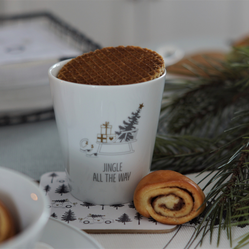Deze prachtige kerstmok met de tekst Jingle all the way is in de kerstperiode dagelijks te gebruiken tijdens gezellige koffiemomenten thuis of op kantoor. De tekst staat aan beide zijden van de mok.