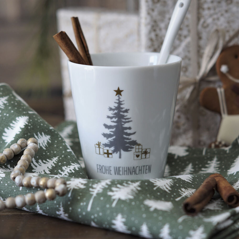 Deze prachtige kerstmok met de tekst Frohe Weihnachten is in de kerstperiode dagelijks te gebruiken tijdens gezellige koffiemomenten thuis of op kantoor. De tekst staat aan beide zijden van de mok.