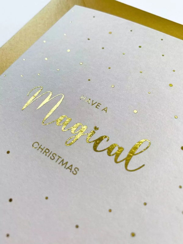 Mooie, dubbele kerstkaart met de tekst Have a Magical Christmas. Om een kerstkaartje te sturen in stijl en voorzien van een mooi laagje goudfolie! Aan de binnenkant is genoeg plek voor een persoonlijke boodschap (inclusief mooie, glanzende envelop).