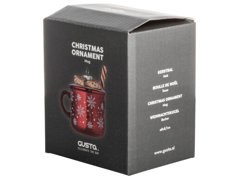 Deze vrolijke kerstbal is gemaakt van glas en afgewerkt met verschillende details in de kleuren rood en wit. De mok heeft een diameter van 8 cm en een hoogte van 8,7 cm.