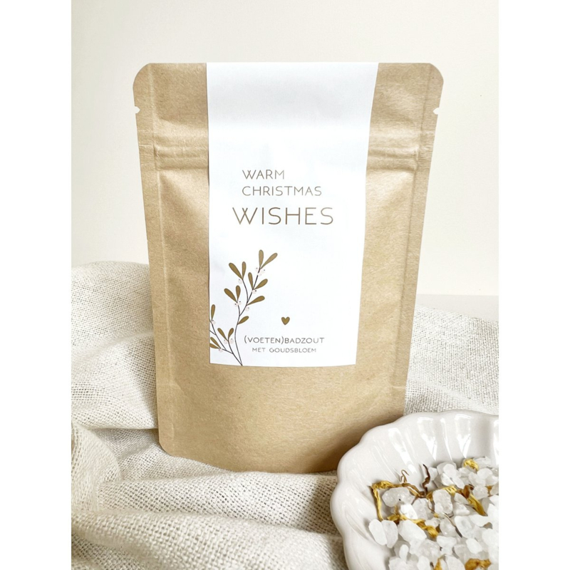Mooi zakje (voeten)badzout met goudsbloem met de tekst Warm Christmas wishes. Dit is gegarandeerd een leuk kerstcadeau om te geven of te ontvangen.